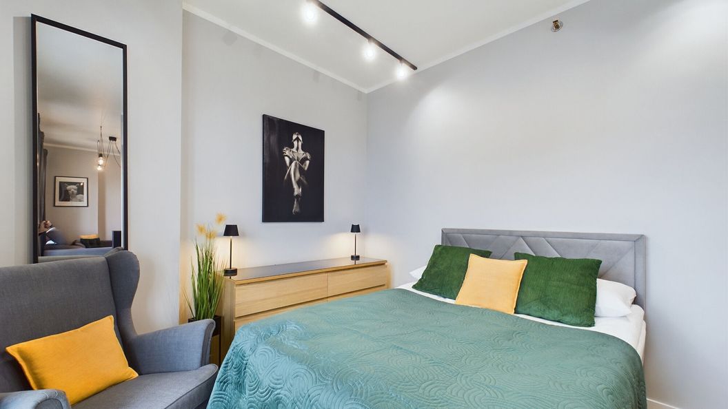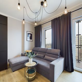Stylowy apartament o powierzchni 36 m² może ugościć w swoim wnętrzu 4 osoby. Jego przestrzeń składa się z salonu z aneksem kuchennym, sypialni, łazienki oraz balkonu. Elegancki wystrój z elementami czerni, szarości oraz drewna sprawi, że nasi goście poczują się tu naprawdę wyjątkowo. Wyposażenie najwyższej jakości i doskonale dobrane dodatki umilą pobyt oraz sprawią, że będzie on jak najbardziej komfortowy. Przestronny salon wyposażony jest w wygodną rozkładaną sofę, komodę oraz telewizor. Znajduje się w nim również stół z krzesłami, przy którym nasi Goście będą mogli komfortowo spożywać posiłki. Wyposażenie multimedialne apartamentu stanowi nowoczesny telewizor z funkcją SmartTV oraz dostęp do Internetu w postaci sieci WIFI. Nowoczesny aneks kuchenny został w pełni wyposażony we wszystkie niezbędne przybory do przygotowywania posiłków. Dostępne są w nim liczne udogodnienia, takie jak: lodówka z zamrażarką, zmywarka, zestaw do parzenia kawy i herbaty czy piekarnik. Osobna sypialnia gwarantuje prywatność, a znajdujące się w niej łóżko małżeńskie pozwoli na relaks po całym dniu. Przytulna łazienka posiada prysznic, suszarkę do włosów, ręczniki oraz zestaw kosmetyków. Z dużego balkonu podziwiać można piękny widok na Warszawę, z 6 piętra.