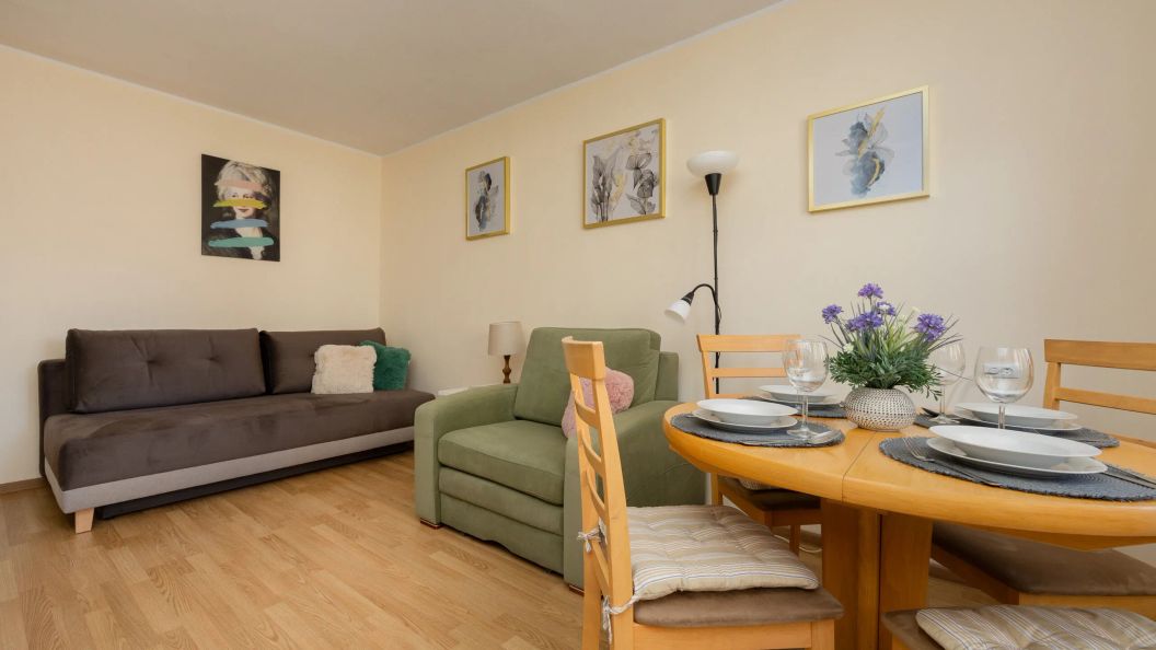 Mieszkanie o powierzchni 26 m² przeznaczone jest dla maksymalnie 4 osób. Przestrzeń dzienna została wyposażona w rozkładaną, 2-osobową sofę oraz dodatkowy rozkładany fotel, które pełnią funkcję miejsc do spania. W pokoju znajduje się również stół z krzesłami, tworzący część jadalnianą.