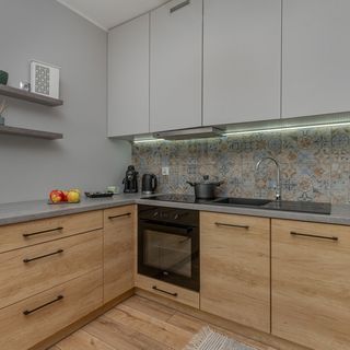 Kuchenka indukcyjna, lodówka, czajnik elektryczny, naczynia, sztućce, szklanki, kubki, patelnia, zestaw garnków, piekarnik, kuchenka mikrofalowa, ekspres przelewowy