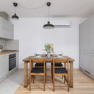 Płyta indukcyjna, piekarnik, lodówka z zamrażarką, zmywarka, czajnik, zestaw naczyń kuchennych i stołowych, stół z 4 krzesłami