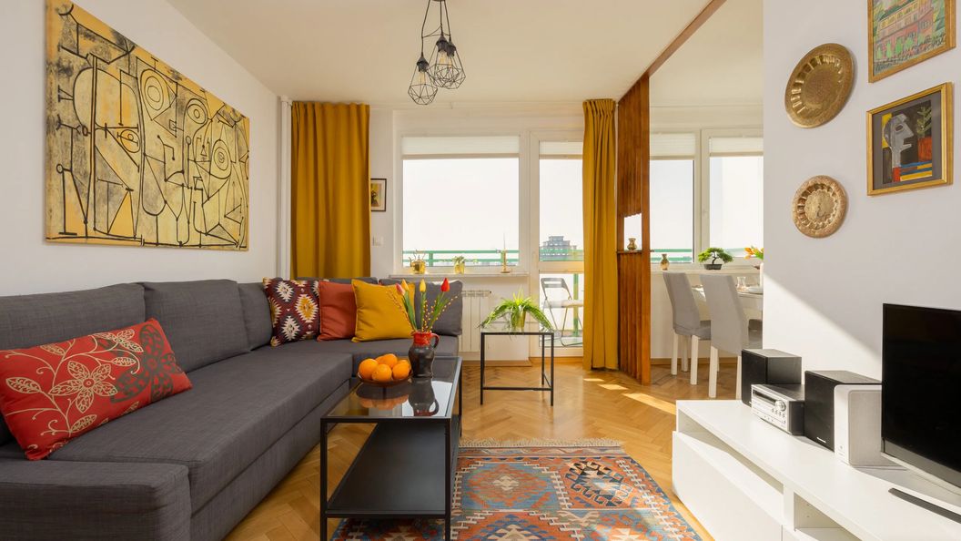 Jasny i przytulny apartament posiada powierzchnię 48 m² i z przyjemnością ugości 5 osób. Jego wyjątkowa przestrzeń złożona jest z salonu, dwóch osobnych sypialni, aneksu kuchennego, łazienki oraz balkonu. Został on zaprojektowany z dbałością o każdy najmniejszy szczegół oraz w pełni wyposażony we wszystkie niezbędne meble oraz udogodnienia. Salon wyposażony został w podwójną rozkładana sofę, telewizor, komodę oraz stół z krzesłami. W pierwszej sypialni znajduje się wygodne łózko małżeńskie, które pozwoli na pełen relaks. Druga sypialnia wyposażona jest w pojedyncze łóżko, szafkę oraz biurko z krzesłem. Dzięki niemu oraz dostępnej w apartamencie sieci WIFI nasi Goście będą mogli zadbać o swoje obowiązki służbowe podczas pobytu. Aneks kuchenny został w pełni wyposażony we wszystkie przedmioty niezbędne do przygotowywania posiłków. Dostępne są w nim takie udogodnienia jak lodówka z zamrażarką, piekarnik, kuchenka mikrofalowa oraz zestaw do parzenia kawy i herbaty. Nowoczesna łazienka posiada wannę, zestaw ręczników oraz suszarkę do włosów. Na balkonie z meblami ogrodowymi nasi Goście będą mogli wypić filiżankę ulubionej kawy i spędzić miło czas. Apartament z przyjemnością ugości również zwierzęta domowe za dodatkową opłatą. Będzie on doskonałym wyborem podczas pobytu w Warszawie z rodziną lub przyjaciółmi.