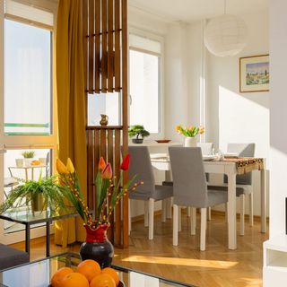 Podwójna rozkładana sofa, telewizor, stół z krzesłami, stolik kawowy
