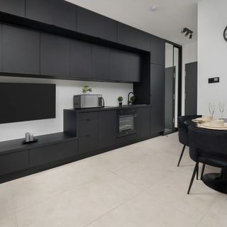 Czajnik, lodówka z zamrażalką, szklanki, zestaw garnków, sztućców, patelnia, kuchenka mikrofalowa, płytę indukcyjną, zmywarka