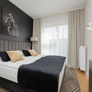 Ten wyjątkowy apartament może być wygodnym noclegiem dla 4 osób – idealny na romantyczny pobyt z drugą połówką czy wyjazd z przyjaciółmi. Układ pomieszczeń składa się z salonu z aneksem kuchennym, sypialni, balkonu oraz łazienki z prysznicem. W salonie znajduje się stół z krzesłami do wspólnego celebrowania posiłków. Do apartamentu przynależy balkon, gdzie można delektować się poranną kawą lub odpoczywać po dniu pełnym wrażeń. Paleta barw nadaje mieszkaniu wyjątkowego charakteru. Wysublimowana aranżacja apartamentu oraz wysokiej jakości wyposażenie gwarantują pobyt na najwyższym poziomie. Apartament wyposażony jest w nowoczesne udogodnienia, takie jak bezpłatny dostęp do sieci Wi-Fi oraz Smart TV – idealny na seanse filmowe. Pełne wyposażenie łazienkowe i kuchenne - takie jak pralka z funkcją suszarki, suszarka do włosów, kuchenka mikrofalowa, zmywarka, płyta indukcyjna - zwiększa niezależność naszych gości. Na dobry początek każdego pobytu zapewniony jest bezpłatny zestaw kosmetyków, ręczniki i pościel. Do apartamentu przynależy również prywatne miejsce postojowe w hali garażowej, co jest atutem, szczególnie w stolicy. Lokalizacja apartamentu z pewnością pozwoli poczuć klimat miasta wśród najważniejszych atrakcji. Dzięki tym zaletom apartament ten jest idealnym wyborem na beztroski pobyt w Warszawie.