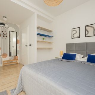 W pełni wyposażone studio w atrakcyjnej lokalizacji przeznaczone jest do zakwaterowania 2 osób - to świetne rozwiązanie na wyjazd dla pary lub w celach biznesowych! Wysoce funkcjonalna przestrzeń o powierzchni 23 m² oferuje część dzienną z wygodnym miejscem do spania i częścią jadalnianą, w pełni wyposażony aneks kuchenny oraz łazienkę z prysznicem i toaletą. Multimedia obejmują telewizor Smart TV z telewizją internetową i szybki bezpłatny Internet Wifi. Szeroki wachlarz udogodnień oraz kompleksowe wyposażenie apartamentu w niezbędne akcesoria i sprzęty kuchenne, jak i łazienkowe gwarantuje komfort pobytu. Dla ułatwienia rozpoczęcia każdej wizyty zapewniono bezpłatny zestaw kosmetyków (mydło, szampon, żel pod prysznic), ręczniki oraz pościel. Oryginalna tapeta z mapą Warszawy podkreśla metropolitalny charakter studia. Profesjonalnie zaprojektowane wnętrze z niebieskim akcentem kolorystycznym oraz minimalistycznymi detalami jest stylowe i nowoczesne.