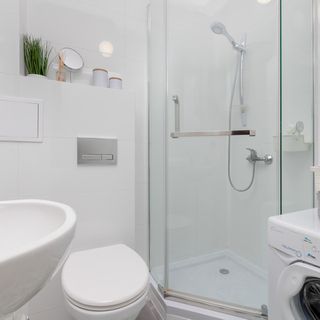 Prysznic, szafka z umywalką, lustro, pralka, toaleta