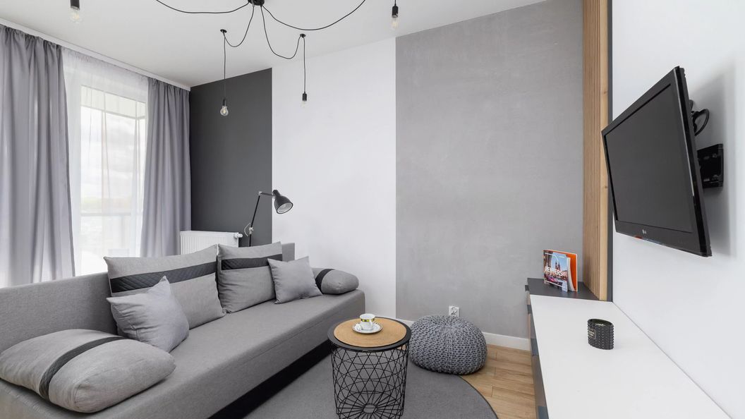 Ten nowoczesny i elegancki apartament jest przeznaczony dla czterech osób i ma jedną sypialnię. Został on starannie urządzony, dzięki czemu aranżacja wykorzystuje kontrastujące ze sobą barwy i wygląda bardzo stylowo. Dominują tutaj kolory takie jak biel, czerń i odcienie szarości. Funkcjonalne wyposażenie sprawia, że przygotowywanie posiłków czy też wieczorny relaks są prawdziwą przyjemnością. Lokal dysponuje umeblowanym balkonem dostępnym z salonu, na którym stoi stolik oraz dwa krzesła ogrodowe. Sprawia to, że goście mogą wypić poranną kawę lub zjeść przekąskę na powietrzu, podziwiając widok na okolicę. W sypialni stoi duże i wygodne łóżko dwuosobowe, a o komfort przechowywania ubrań i innych drobiazgów dba obecność pojemnej szafy oraz szafek. Uczestnicy wyjazdów biznesowych mogą pracować zdalnie przy zlokalizowanym w pomieszczeniu biurku z krzesłem. W salonie znajduje się rozkładana sofa dwuosobowa w ciemnoszarym odcieniu, szafka, jadalniany stół z krzesłami, stolik oraz telewizor z dostępem do kanałów kablowych. Aneks kuchenny został z kolei wyposażony w takie sprzęty jak między innymi piekarnik, kuchenka mikrofalowa, lodówka z zamrażarką czy też przelewowy ekspres do kawy. W łazience na gości czeka powitalny zestaw kosmetyków wraz z ręcznikami i suszarką do włosów. Dostępny jest tu również prysznic i pralka. Odwiedzający mogą przyjeżdżać tutaj ze swoimi zwierzętami.