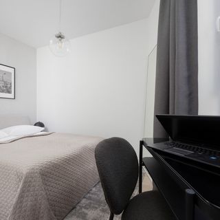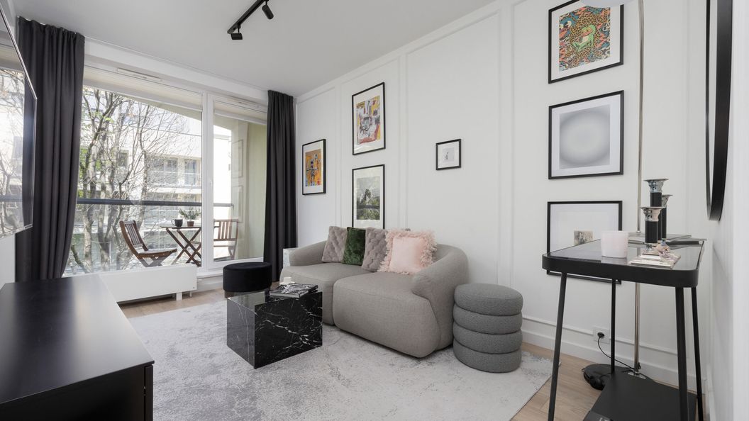 Nowoczesny apartament typu studio mieści się na trzecim piętrze i może pomieścić dwie osoby. To doskonała opcja dla par lub osób podróżujących w pojedynkę. Wnętrze jest minimalistyczne, a kolorystyka opiera się na sprawdzonym połączeniu bieli, czerni i szarości. Część sypialniana oddzielona jest ścianą, a dwa miejsca noclegowe znajdują się na wygodnym łóżku małżeńskim. Dodatkowe miejsce do odpoczynku stanowi nierozkładana sofa, która idealnie sprawdzi się jako miejsce odpoczynku po intensywnym dniu. Pyszny posiłek przygotować można za pomocą znajdującej się w aneksie kuchennym płyty indukcyjnej oraz kuchenki mikrofalowej. Dodatkowy atut stanowi zmywarka. Podczas cieplejszych dni zaparzonej w ekspresie kapsułkowym kawy można napić się na przynależącym do apartamentu umeblowanym balkonie. W łazience znajduje się wygodna wanna ręczniki oraz zestaw bezpłatnych kosmetyków. Pralka z pewnością przyda się w trakcie dłuższych wyjazdów. Apartament przystosowany jest do pracy zdalnej – w części sypialnianej znaleźć można biurko wraz z krzesłem, a we wszystkich pokojach dostępne jest szybkie połączenie WiFi. Dodatkowe udogodnienie multimedialne stanowi duży telewizor z płaskim ekranem i funkcją SmartTV+.
