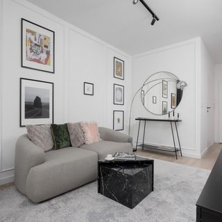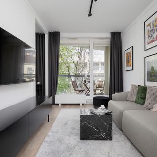 Sofa, stolik, komoda, telewizor z płaskim ekranem, lustro, pufy, lampki, wyjście na balkon.