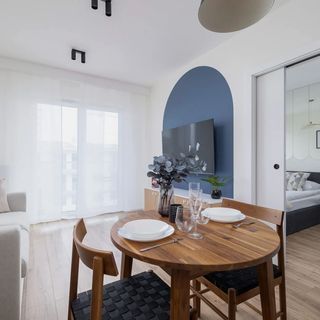 Komfortowy apartament zapewnia nocleg dla 4 osób. Wnętrze charakteryzuje się subtelnym połączeniem klasyki z nowoczesnymi akcentami, co tworzy wyjątkową, przytulną atmosferę. W salonie znajduje się wygodna sofa, naprzeciw telewizora. Z salonu jest wyjście na balkon, gdzie można rozpocząć dzień od filiżanki aromatycznej kawy, ciesząc się pierwszymi promieniami słońca, lub zakończyć go lampką wina pod gwiaździstym niebem. Balkon jest idealnym miejscem na chwile relaksu oraz odpoczynku na świeżym powietrzu, bez konieczności opuszczania mieszkania. Kuchnia, zaprojektowana z myślą o funkcjonalności i estetyce, wyposażona jest w niezbędne sprzęty kuchenne, które ułatwiają przygotowywanie codziennych posiłków. Dopasowane kolorystycznie do wnętrza apartamentu szafki kuchenne doskonale komponują się z drewnianymi blatami, tworząc przytulne, ale i nowoczesne miejsce do gotowania. Sypialnia to przestrzeń zaprojektowana z myślą o spokoju i odpoczynku. Dominują tu spokojne kolory i delikatne oświetlenie. Centralne miejsce zajmuje duże, wygodne łóżko z wysokiej jakości materacem, zapewniające zdrowy sen. Przemyślane rozmieszczenie szafek, półek i biurka zapewnia wystarczająco miejsca na przechowywanie ubrań, pozostawiając jednocześnie dużo wolnej przestrzeni. Łazienka łączy w sobie funkcjonalność z nowoczesnym designem. Wielofunkcyjny prysznic zapewnia komfort użytkowania, a dodatki w postaci eleganckich, minimalistycznych akcesoriów łazienkowych dopełniają całość.