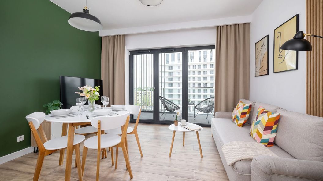 Część dzienna została wyposażona w rozkładaną sofę oraz telewizor z funkcją Smart TV. Zintegrowany aneks kuchenny jest w pełni przygotowany do samodzielnego przygotowywania posiłków i posiada płytę indukcyjną, piekarnik, zmywarkę oraz lodówkę. W łazience znajduje się prysznic oraz pralka. Obiekt zapewnia również ręczniki, zestaw kosmetyków i deskę do prasowania.