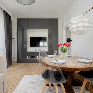 Sofa narożnik, TV, stół z krzesłami, wyjście na balkon