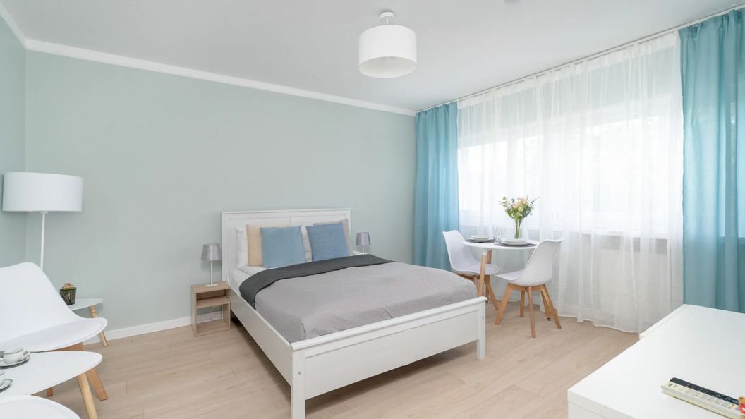 Jasny, elegancki apartament może ugościć 4 osoby i posiada powierzchnię 37 m². Został zaprojektowany w przyjemnych, pastelowych kolorach i wyposażony w niezwykle funkcjonalne i stylowe meble oraz sprzęty domowe. Przestrzeń mieszkania składa się z salonu, osobnej sypialni, kuchni oraz łazienki z prysznicem. W salonie znajduje się wygodne łóżko małżeńskie, szafki nocne, stół z krzesłami oraz nowoczesny telewizor. Osobna sypialnia wyposażona jest w dwa łóżka pojedyncze i biurko z krzesłem. Bedzie to doskonały pokój na przykład dla najmłodszych, a przy biurku można również zadbać o swoje obowiązki służbowe, pracując zdalnie. W jasnej kuchni dostępne są wszystkie niezbędne przybory do przygotowywania posiłków. Kuchnia posiada również ekspres do kawy, kuchenkę mikrofalową oraz lodówkę z zamrażarką. W łazience znajduje się kabina prysznicowa, pralka, suszarka do włosów oraz ręczniki dla naszych Gości. W apartamencie zapewniona jest oczywiście świeża pościel oraz dostęp do Internetu w postaci sieci WIFI. Apartament z przyjemnością ugości również Państwa zwierzęta domowe.