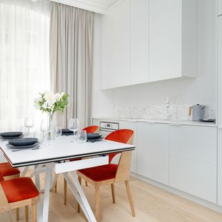 Płyta indukcyjna, lodówka z zamrażarką, ekspres do kawy (kapsułkowy), czajnik elektryczny, piekarnik, stół z 4 krzesłami, zastawa kuchenna