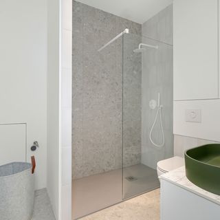 Prysznic, szafka z umywalką, lustro, toaleta