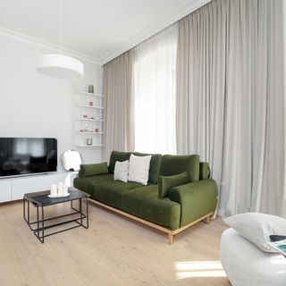 Rozkładana sofa, fotel, telewizor, stoliki kawowe