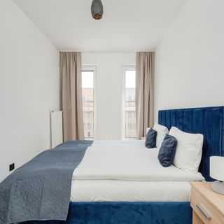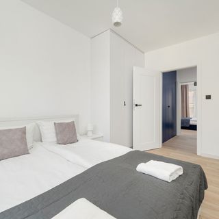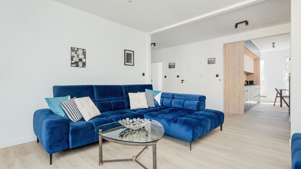Ten ekskluzywny i komfortowy w użytkowaniu apartament jest przeznaczony dla sześciu osób. Dysponuje on dwiema sypialniami - w każdej z nich stoi wygodne, duże łóżko dwuosobowe, a także szafa i dwie szafki. Nowoczesny i stylowy wystrój pomieszczeń jest starannie dopracowany, dzięki czemu w lokalu jest przytulnie i elegancko. W salonie stoi gustowny narożnik rozkładany w ciemnoniebieskim odcieniu. W pomieszczeniu znajduje się również stolik, przy którym można napić się kawy czy też zjeść przekąskę podczas oglądania telewizji z dostępem do kanałów kablowych. Z pomieszczenia można wyjść na umeblowany balkon, na którym umieszczono stolik i dwa krzesła. Jest to świetne miejsce dla tych, którzy lubią relaksować się na powietrzu w przerwie od zaplanowanych aktywności. Apartament ma oddzielną kuchnię, w której zaaranżowano przestrzeń jadalnianą ze stołem i krzesłami. O komfort przygotowywania posiłków dba dostępność takich sprzętów jak kuchenka mikrofalowa, płyta indukcyjna czy też piekarnik. W lokalu dostępna jest klimatyzacja. W łazience na gości czeka powitalny zestaw kosmetyków, suszarka do włosów, pralka i prysznic. Wystrój utrzymany jest w stonowanych barwach, a o urozmaicenie aranżacji dbają wyraziste akcenty kolorystyczne.