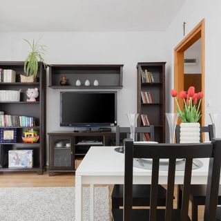 Rozkładana sofa dwuosobowa, szafki, telewizor, stół, krzesła