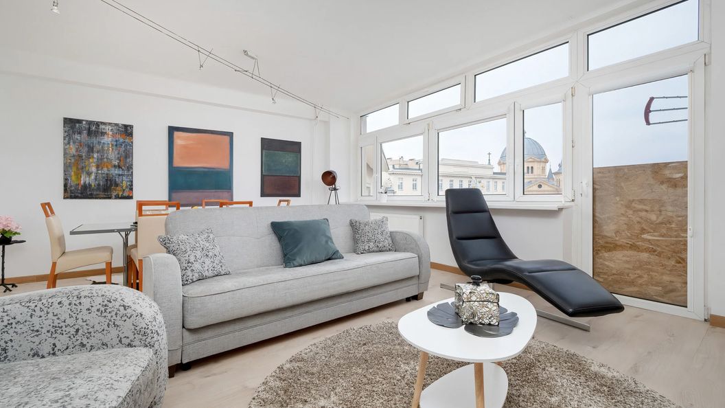 Apartament przy Placu Wolności w samym sercu Łodzi łączy w sobie wyjątkową lokalizację z wygodą i funkcjonalnością, tworząc idealną przestrzeń do życia. Okolica zapewnia dostęp do bogatej infrastruktury miejskiej. Przystanki tranzytowe i tramwajowe oddalone są o 15 m od apartamentu (przystanek Plac Wolności). Doskonała komunikacja miejska sprawia, że podróżowanie po Łodzi jest łatwe i wygodne. W pobliżu znajdują się restauracje, kawiarnie, sklepy i inne miejsca rozrywki, które umilą czas pobytu, takie jak Muzeum Światła (400 m), Stary Ratusz Miejski (180 m) lub Muzeum Archeologiczne i Etnograficzne (70 m). Dojazd samochodem do Aquaparku Fala zajmie ok. 15 min, do Galerii Manufaktura ok. 5 min, a pieszo 10 min. Mimo centralnego położenia apartamentu, bardzo szybko można dotrzeć do terenów zielonych w tym Parku Staromiejskiego oddalonego o 300 m lub Parku Helenów, do którego można dotrzeć spacerem w ciągu 10 min.