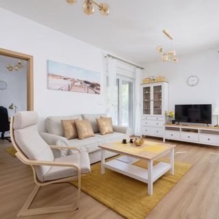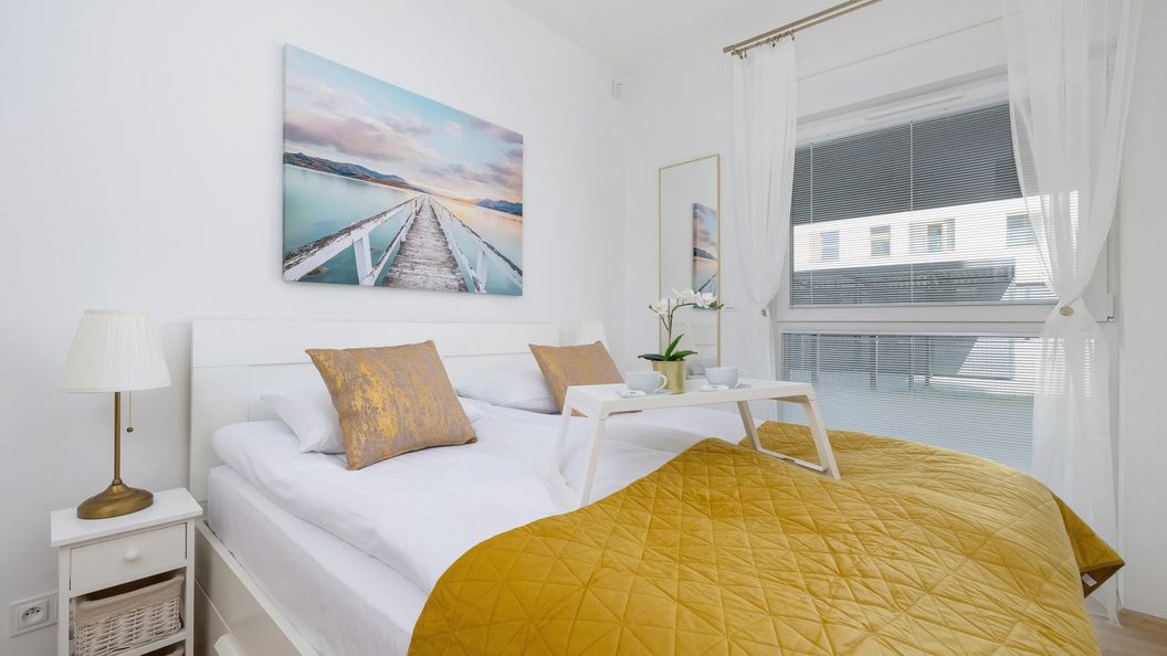 Przestronny i nowoczesny dwupiętrowy apartament o powierzchni 50 m2 oferuje nocleg dla sześciu osób. Aranżacja wnętrza wykonana jest z najwyższą starannością i dbałością o szczegóły, stanowi doskonałą kombinację komfortu i stylu. Wnętrze apartamentu składa się z salonu, balkonu, dwóch sypialni i aneksu kuchennego i łazienki. Centralnym punktem mieszkania jest jasny, przestronny salon, który dzięki zastosowaniu modułowej kanapy i minimalistycznych półek i szafek zapewnia wiele możliwości aranżacyjnych. Ściany zdobią subtelne, nowoczesne obrazy i fotografie, które nadają indywidualnego charakteru. Do salonu i jednej z sypialni przylega otwarty taras, idealny do wypicia porannej kawy czy wieczornego relaksu na świeżym powietrzu. Otwarty aneks kuchenny, zaprojektowany z myślą o funkcjonalności i estetyce, wyposażony jest w nowoczesne sprzęty kuchenne, które ułatwiają przygotowywanie codziennych posiłków. Jasne, lakierowane szafki kuchenne doskonale komponują się z drewnianymi blatami, tworząc przytulne, ale i nowoczesne miejsce do gotowania. Obie sypialnie to przestrzenie zaprojektowane z myślą o spokoju i odpoczynku. Dominują tu miękkie tkaniny, spokojne kolory i delikatne oświetlenie. W jednej z nich centralne miejsce zajmuje duże, wygodne łóżko z wysokiej jakości materacem, zapewniające zdrowy sen. Przemyślane rozmieszczenie szafek i półek zapewnia wystarczająco miejsca na przechowywanie, pozostawiając jednocześnie dużo wolnej przestrzeni. Z kolei druga sypialnia wyposażona jest z wygodną rozkładaną sofę, telewizor oraz biurko. Łazienka łączy w sobie funkcjonalność z nowoczesnym designem. Jasne, połyskujące płytki na ścianach optycznie powiększają przestrzeń, a drewniane elementy wprowadzają do wnętrza ciepło. Wielofunkcyjny prysznic zapewnia komfort użytkowania, a dodatki w postaci eleganckich, minimalistycznych akcesoriów łazienkowych dopełniają całość.