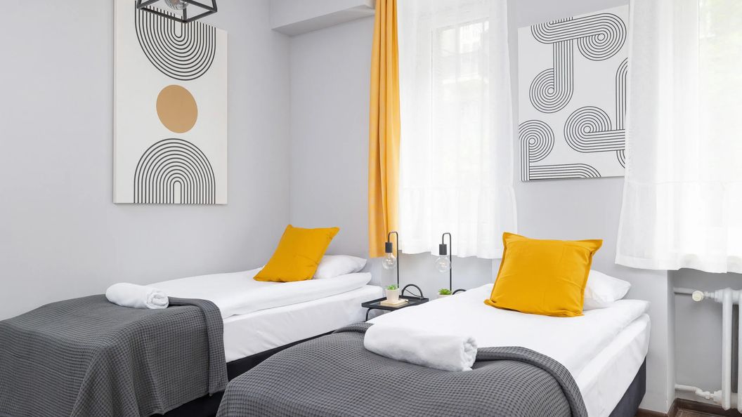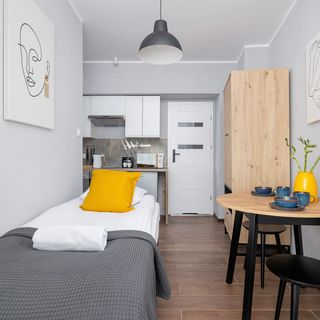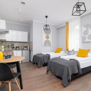 Te nowoczesne i stylowe apartamenty zostały urządzone o funkcjonalność i komfort użytkowania dostępnej przestrzeni. Znajdują się one na parterze i są przeznaczone dla dwóch osób. W wystroju dominują subtelne odcienie szarości oraz biel, choć pojawiają się również dbające o urozmaicenie aranżacji żółte akcenty. Część mieszkalna została wyposażona w dwa łóżka pojedyncze, pojemną szafę do przechowywania przywiezionych ubrań i innych drobiazgów, telewizor z dostępem do kanałów naziemnych oraz stół, przy którym można usiąść, aby zjeść przekąskę lub posiłek, czy też wypić poranną kawę. Dania można szybko i wygodnie przygotowywać w praktycznie urządzonym aneksie kuchennym. Ma on do zaoferowania gościom takie sprzęty jak piekarnik, kuchenka mikrofalowa, a także przelewowy ekspres do kawy. W łazience dostępny jest prysznic, powitalny zestaw kosmetyków, suszarka do włosów i ręczniki. Każde studio zostało również wyposażone w pralko-suszarkę, żelazko i deskę do prasowania oraz odkurzacz. Zwierzęta są tutaj akceptowane, dzięki czemu goście nie muszą ich zostawiać w domu na czas krótkoterminowego czy też długoterminowego pobytu.