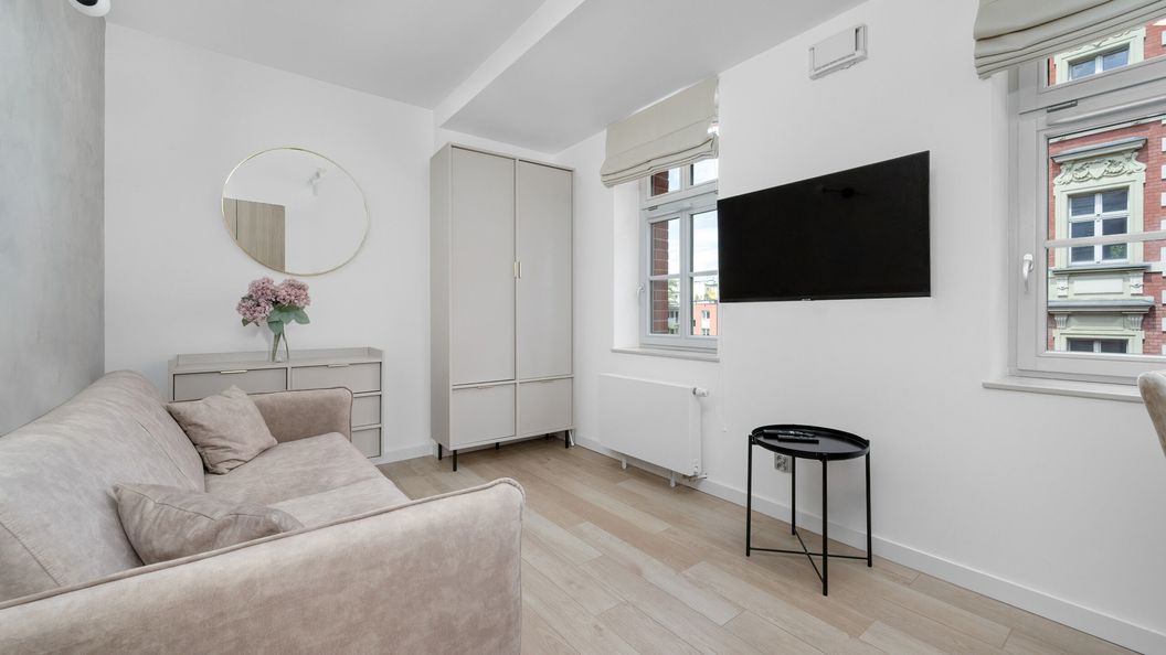Urokliwe studio o powierzchni 21,15 m² jest idealne na pobyt dla maksymalnie dwóch osób. Główne pomieszczenie to funkcjonalny salon z aneksem kuchennym, zaprojektowany z myślą o komforcie i wygodzie. W salonie znajduje się rozkładana sofa, pojemna szafa oraz płaski TV, dzięki któremu można cieszyć się rozrywką na najwyższym poziomie. Przytulna przestrzeń do spożywania posiłków obejmuje stół z dwoma krzesłami. Aneks kuchenny jest w pełni wyposażony, oferując lodówkę, piekarnik, zmywarkę, kuchenkę mikrofalową oraz czajnik elektryczny, co umożliwia przygotowywanie posiłków w domowych warunkach. Dodatkowo w apartamencie znajduje się nowoczesna łazienka, wyposażona w prysznic. To studio jest idealnym wyborem dla par lub osób podróżujących służbowo, szukających komfortu i wygody w kompaktowej, dobrze zaprojektowanej przestrzeni.