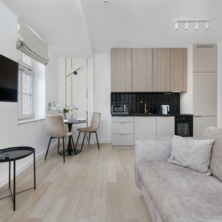 Rozkładana sofa, TV, szafa, komoda, stolik z dwoma krzesłami