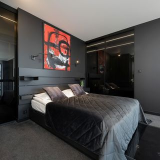Łóżko dwuosobowe, sofa rozkładana, półki i lampki nocne, szafa, biurko z krzesłem, toaletka, garderoba, pralko-suszarka.