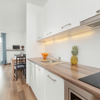 Płyta indukcyjna, lodówka z zamrażarką, kuchenka mikrofalowa, czajnik elektryczny, ekspres do kawy (kapsułkowy), komplet naczyń, przybory kuchenne