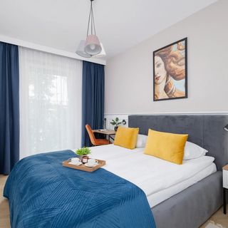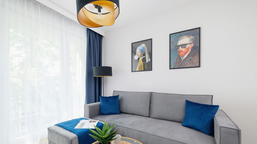Ten ekskluzywny oraz prestiżowy apartament znajduje się na czwartym piętrze nowoczesnego budynku i jest przeznaczony dla czterech osób. W lokalu dostępna jest klimatyzacja, co zapewnia komfort pobytu. Wystrój wnętrza jest elegancki i kojarzy się z luksusem. O urozmaicenie jasnej przestrzeni dbają ciemne, a także drewniane akcenty oraz starannie dobrane dekoracje. Dominującą barwą jest tutaj biel, choć w pomieszczeniach znaleźć można również odcienie szarości, niebieskiego czy też żółtego. W salonie umieszczono rozkładaną sofę, jadalniany stół z krzesłami, szafkę na podręczne drobiazgi oraz stolik, przy którym można usiąść, aby zrelaksować się przy telewizji kablowej. W pomieszczeniu znajduje się również wyjście na balkon, z którego można podziwiać spokojną, zieloną okolicę. W sypialni mieści się duże łóżko dwuosobowe, pojemna szafa i biurko z krzesłem pozwalające na wygodną pracę zdalną. Posiłki można przygotowywać w funkcjonalnie urządzonym aneksie kuchennym – do dyspozycji odwiedzających są tutaj takie sprzęty jak kuchenka mikrofalowa, czajnik gazowy czy też lodówka z zamrażarką. W łazience na gości czeka powitalny zestaw kosmetyków, ręczniki, pralka, suszarka do włosów oraz wanna, która jest idealnym rozwiązaniem dla osób ceniących luksusowy, wieczorny relaks. Rodzice podróżujący z pociechą mogą skorzystać z dostępnego w apartamencie łóżeczka dziecięcego.