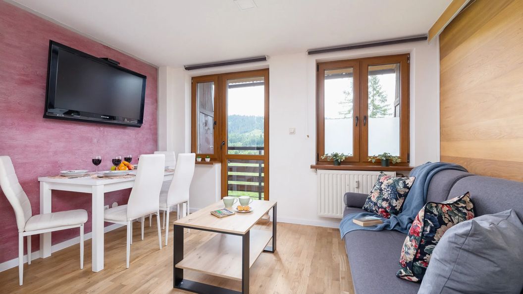 Ten komfortowy apartament oferuje nocleg dla 4 osób - to świetny wybór na pobyt w gronie rodziny lub przyjaciół! Wysoce funkcjonalna przestrzeń o powierzchni 32 m² składa się z salonu połączonego z aneksem kuchennym i częścią jadalnianą, osobnej sypialni oraz łazienki z prysznicem. Dużym atutem tego mieszkania są dwa umeblowane balkony - jeden z salonu z widokiem na Gubałówkę, drugi z sypialni z widokiem na Giewont. Część dzienna wyposażona w wygodną sofę oraz telewizor z płaskim ekranem, jak również sypialnia z bardzo wygodnym łóżkiem małżeńskim, stanowią doskonałe miejsce odpoczynku i relaksu. Do dyspozycji gości zapewniono udogodnienia multimedialne – 50" telewizor z dostępem do ponad 100 kanałów oraz bezpłatne łącze Internetowe Wifi. Apartament zaopatrzony jest w podstawy niezbędne do udanego wypoczynku. Szeroki wachlarz udogodnień oraz kompleksowe wyposażenie apartamentu w akcesoria i sprzęty kuchenne, jak i łazienkowe gwarantuje komfort pobytu. Dla ułatwienia rozpoczęcia każdej wizyty zapewniono bezpłatny zestaw kosmetyków (mydło, szampon i żel pod prysznic), ręczniki oraz pościel. Obiekt przyjemnie zaaranżowany i estetyczny, a dzięki umiejętnie dobranym dodatkom, także przytulny. To świetny wybór dla każdego, kto ceni sobie wygodę i funkcjonalność. Lokalizacja apartamentu z pewnością pozwoli poczuć klimat miasta i gór wśród najważniejszych atrakcji.