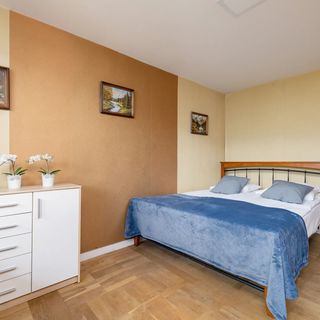 Łóżko małżeńskie, komplet pościeli, komoda, wyjście na balkon