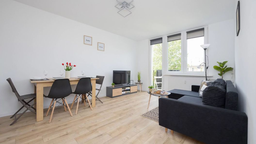Rozkładana sofa, TV, szafka RTV, stół z krzesłami, wyjście na balkon