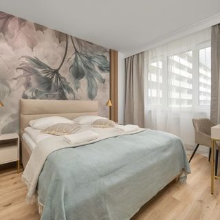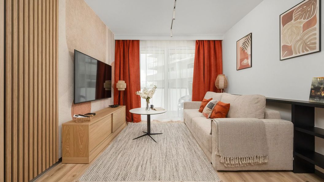 Stylowy, klimatyzowany apartament może ugościć 4 osoby - jest to idealny wybór na rodzinny wyjazd lub dla grupki przyjaciół. Wysoce funkcjonalna przestrzeń o powierzchni 46 m² składa się z salonu z aneksem kuchennym, sypialni oraz łazienki z prysznicem. Jego klimatyczne wnętrze zapewni znakomitą, spokojną atmosferę. Część dzienna wyposażona w wygodną sofę oraz telewizor Smart TV z dostępem do kanałów kablowych stanowi doskonałe miejsce odpoczynku i relaksu. Do dyspozycji gości jest także balkon z meblami ogrodowymi – idealne miejsce na łyk porannej kawy, czy odpoczynek po całym dniu zwiedzania. Apartament posiada dostęp do szybkiego bezpłatnego Internetu Wifi. Przytulna sypialnia oferują bardzo wygodne łóżko małżeńskie, pojemną szafę z lustrem, a także biurko z krzesłem, dzięki czemu goście pracujący zdalnie będą mogli w komfortowy sposób zadbać o obowiązki służbowe. Szeroki wachlarz udogodnień oraz kompleksowe wyposażenie apartamentu w niezbędne akcesoria i sprzęty kuchenne, jak i łazienkowe gwarantuje komfort pobytu. Dla ułatwienia rozpoczęcia każdej wizyty zapewniono bezpłatny zestaw kosmetyków (mydło, szampon i żel pod prysznic), ręczniki oraz pościel. Na wyposażeniu mieszkania goście znajdą również pralkę, co z pewnością docenią rodziny z małymi dziećmi czy osoby planujące dłuższy pobyt. Apartament w modnych odcieniach beżu, z dodatkiem barwnych elementów, wyróżnia się starannym wykończeniem oraz pięknym designem. Wnętrze jest nowoczesne i funkcjonalnie zaprojektowane, wychodząc naprzeciw wszelkim potrzebom gości.
