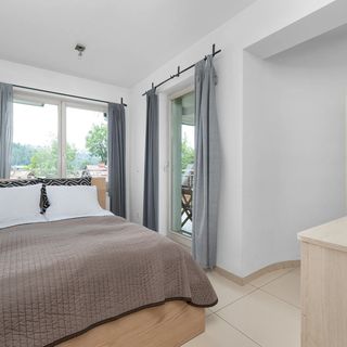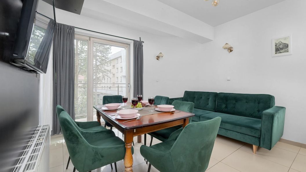 Ten luksusowy apartament ma do zaoferowania gościom piękny widok na góry z trzeciego piętra i może zakwaterować sześć osób. Lokal dysponuje trzema sypialniami. W jednej z nich znajduje się rozkładana sofa dwuosobowa, jadalniany stół z krzesłami oraz telewizor z dostępem do kanałów naziemnych, a w pozostałych dwóch umieszczono duże łóżka dwuosobowe wraz z pojemnymi szafami idealnymi do przechowywania ubrań czy też obuwia. Komfortowe i szybkie przygotowywanie posiłków umożliwia funkcjonalnie wyposażona oddzielna kuchnia, w której znaleźć można sprzęty takie jak kuchenka mikrofalowa, kapsułkowy ekspres do kawy, a także płyta indukcyjna. W łazience na gości czeka powitalny zestaw kosmetyków, ręczniki, prysznic i suszarka do włosów. W apartamencie dostępna jest również dodatkowa toaleta. Poranną kawę można wypić na dwóch umeblowanych balkonach – każdy z nich został wyposażony w stół z krzesłami, dzięki czemu odwiedzający mogą zjeść przekąskę na powietrzu. Wystrój wnętrza jest elegancki i nowoczesny. O stylowy wygląd lokalu dba jasna kuchnia oraz ciemnozielone akcenty w postaci tapicerowanych krzeseł i rozkładanej sofy.