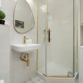 Prysznic, WC, umywalka, szafka, lustro, pralka