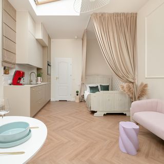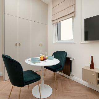 Jasny i przytulny apartament typu studio jest idealne na pobyt dla maksymalnie dwóch osób. Główne pomieszczenie to salon, w którym znajduje się wygodne łóżko małżeńskie, sofa oraz telewizor z funkcją smart zapewniający rozrywkę. W części jadalnej usytuowany jest stół z dwoma krzesłami, co zapewnia komfortowe warunki do spożywania wspólnych posiłków. Aneks kuchenny został zaopatrzony w niezbędne sprzęty oferując wszystko, co potrzebne do przygotowywania potraw. Znajduje się tu lodówka z zamrażarką, płyta indukcyjna, czajnik elektryczny, piekarnik oraz wszelkie niezbędne naczynia i przybory kuchenne. Łazienka została w pełni wyposażona w prysznic toaletę oraz pralkę, co czyni ten apartament idealnym miejscem na dłuższe pobyty. To jasne i komfortowe studio jest idealne miejsce dla osób, które cenią sobie wygodę i funkcjonalność.
