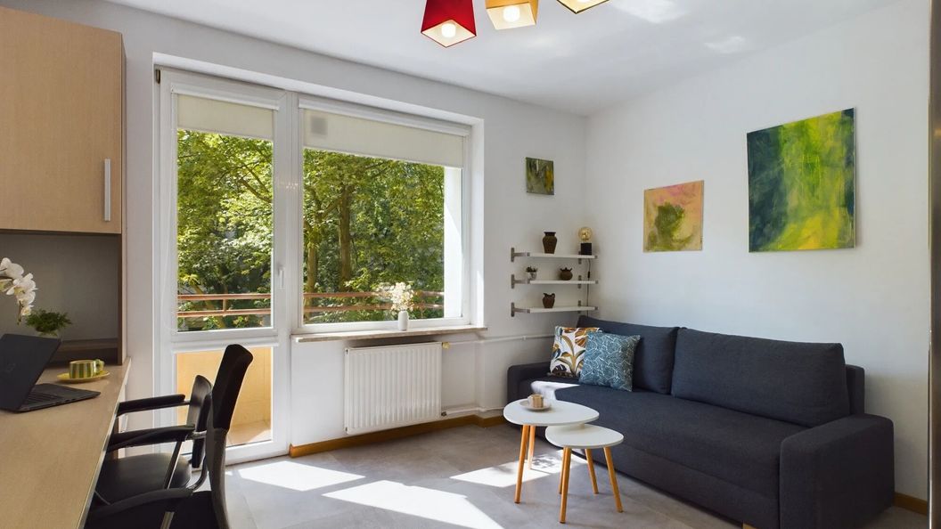 Przestrzeń apartamentu została zaaranżowana jako jedno, funkcjonalne pomieszczenie, które łączy strefę dzienną i sypialnianą. Do dyspozycji gości jest wygodna, rozkładana sofa, telewizor oraz pojemna szafa do przechowywania rzeczy osobistych. Komfort pobytu podnosi wydzielone miejsce do pracy z biurkiem i krzesłem, a także bezpośrednie wyjście na balkon.