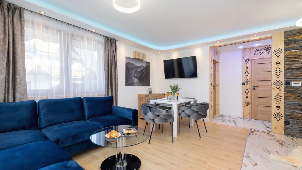 Apartament zlokalizowany jest w domu o tradycyjnej, góralskiej architekturze w zakopiańskiej Jaszczurówce. To spokojna okolica, stanowiąca dogodną bazę wypadową na tatrzańskie szlaki turystyczne.