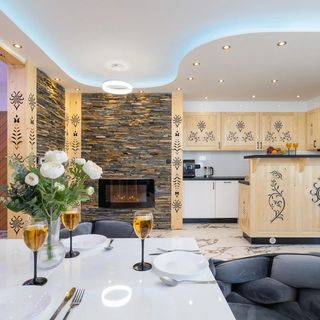 Do dyspozycji gości jest salon połączony z aneksem kuchennym oraz łazienka. Część dzienna wyposażona została w rozkładaną sofę, telewizor z funkcją Smart TV oraz kominek, który nadaje wnętrzu regionalny charakter. W pełni funkcjonalny aneks kuchenny zawiera płytę indukcyjną, zmywarkę, lodówkę oraz ekspres do kawy, co pozwala na samodzielne przygotowywanie posiłków. W łazience znajduje się prysznic.