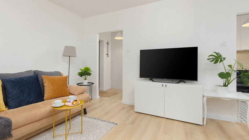 Ten przytulny apartament znajduje się na 1 piętrze i może komfortowo ugościć do 6 osób — jest idealny na pobyty grupowe oraz dla dużych rodzin. Układ pomieszczeń składa się z salonu, kuchni, dwóch sypialni oraz łazienki. Atutem salonu jest wyjście na prywatny balkon z meblami ogrodowymi, gdzie w spokoju można napić się kawy. W obu sypialniach dostępne jest biurko do pracy, dzięki czemu apartament może być również świetną opcją na pobyty biznesowe, ale i nie tylko. Do dyspozycji gości jest telewizor z dostępem do SmartTV i kanałów kablowych oraz bezpłatne Wi-Fi. Apartament posiada pralko-suszarkę, a w pełni wyposażona kuchnia ułatwia przygotowywanie domowych posiłków. Na dobry początek każdego pobytu zapewniono bezpłatny zestaw kosmetyków, ręczniki oraz pościel.