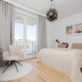 Podwójne łóżko, szafka nocna, szafa na ubrania, biurko, wyjście na balkon