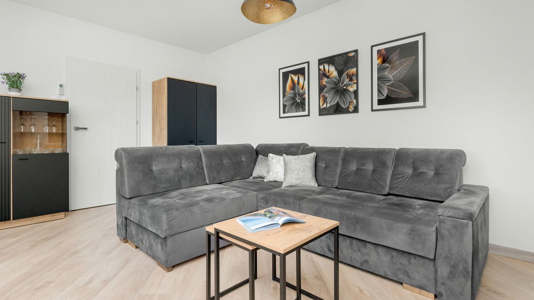 Ten luksusowy apartament dysponuje aż czterema sypialniami, dzięki czemu może on ugościć dziesięć osób. Lokal usytuowany jest na trzecim piętrze budynku i został wyposażony w klimatyzację, która zapewnia gościom komfort pobytu. O wysoki standard apartamentu dba elegancki i nowoczesny wystrój i funkcjonalnie wykorzystana przestrzeń. W aranżacji pojawiają się stonowane odcienie szarości, beżu i czerni, a także delikatny róż i wyrazista, ciemnoniebieska barwa dbająca o urozmaicenie całości kompozycji. Pierwsza sypialnia ma do zaoferowania gościom dwie rozkładane sofy dwuosobowe, jadalniany stół z krzesłami oraz dwa stoliki, przy których można usiąść, aby zrelaksować się wieczorem i zjeść przekąskę. W drugiej sypialni umieszczono duże łóżko dla dwóch osób, szafki i lustro, a trzecie pomieszczenie dysponuje rozkładanym narożnikiem oraz biurkiem z krzesłem do komfortowej pracy zdalnej. W każdej z tych trzech sypialni dostępna jest pojemna szafa idealna do przechowywania ubrań, obuwia czy też innych drobiazgów, a także telewizor z dostępem do kanałów naziemnych. W czwartej sypialni odwiedzający mają do dyspozycji dwa łóżka pojedyncze i szafę. O możliwość prostego i szybkiego przygotowywania posiłków dba praktycznie urządzona, oddzielna kuchnia. Znajdują się w niej sprzęty takie jak przelewowy ekspres do kawy, kuchenka mikrofalowa, piekarnik, płyta indukcyjna, toster i blender. Dodatkowo w pomieszczeniu mieści się przestrzeń jadalniana. W łazience na gości czeka powitalny zestaw kosmetyków wraz z ręcznikami, pralką, suszarką do włosów i prysznicem. Lokal dysponuje też dodatkową toaletą i dwoma balkonami, na które można dostać się z dwóch sypialni. Odwiedzający mogą korzystać tutaj z ładnego widoku na okolicę oraz mebli ogrodowych. Na jednym z balkonów stoi stolik z krzesłami, co sprawia, że można wypić poranną kawę na powietrzu i zrelaksować się przed, po lub w przerwie od zaplanowanych aktywności. Apartament jest doskonałym wyborem dla tych, którzy cenią ekskluzywny wypoczynek i wygodę.