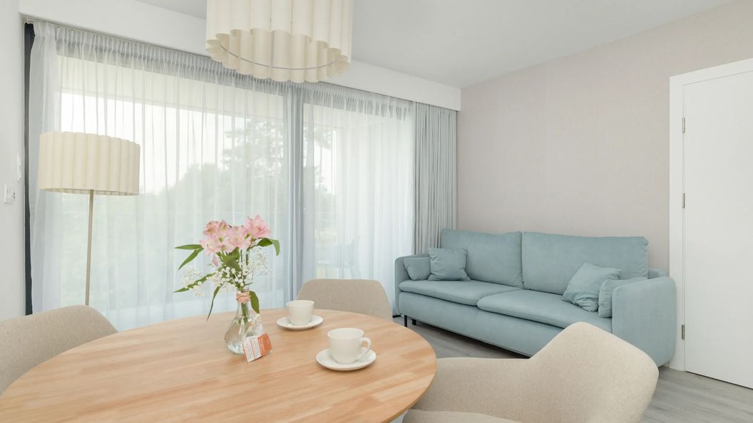 Starannie zaprojektowane wnętrze apartamentu o powierzchni 66 m2 komfortowo ugości 8 osób. Na apartament składają się dwa niezależne pokoje z aneksem kuchennym i łazienkami z prysznicem, które będą idealne na wakacyjny pobyt dla dwóch rodzin lub grupy przyjaciół. Przestrzeń mieszkania oferuje dwa nowoczesne salony z aneksem kuchennym oraz łazienkę z prysznicem. Przytulne wnętrza pozwalają poczuć domową atmosferę, a gustownie dobrane dodatki wprowadzają wakacyjny nastrój. Każdy z pokoi został wyposażony w podwójne, wygodne łóżko oraz przytulną rozkładaną sofę z funkcją spania, która zaprasza do odpoczynku i relaksu po całym dniu zwiedzania, rozkoszując się chwilą spokoju. Z salonu prowadzi wyjście na urokliwy balkon, gdzie meble ogrodowe zachęcają do odpoczynku na świeżym powietrzu, na którym Goście mogą rozkoszować się kawą, przygotowaną w dostępnym ekspresie. Aneks kuchenny wyposażony w wysokiej jakości sprzęty, zachęca do przygotowywania domowych posiłków, którymi można cieszyć się przy wspólnym stole. Wystrój aneksu tworzy harmonijną całość z pozostałą częścią pomieszczenia. W przestronnej łazience znajduje się komfortowy prysznic walk in z deszczownicą, który zapewnia odświeżenie, a dostępna suszarka do włosów zwiększa komfort pobytu. Wieczorną rozrywkę zapewniają multimedia, takie jak telewizor z płaskim ekranem Smart TV, a także bezpłatny dostęp do sieci Wi-Fi. Na dobry początek pobytu zapewniamy gościom bezpłatny zestaw kosmetyków, ręczniki oraz pościel. W ciepłe dni przyjemne ochłodzenie zapewnia klimatyzacja. Dla osób podróżujących samochodem niewątpliwą zaletą jest zapewnione miejsce w garażu podziemnym. Dodatkowo właściciele czworonogów są mile widziani ze swoimi pupilami.
