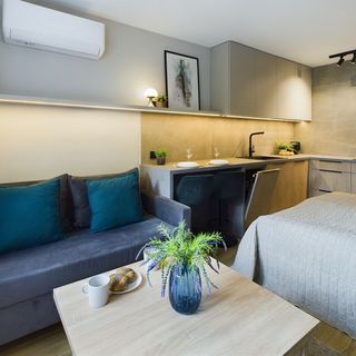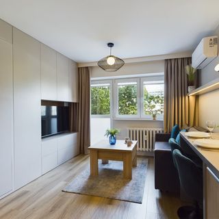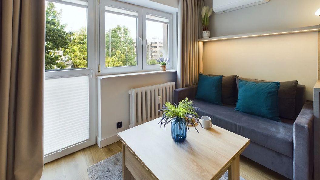 Jasny i przytulny apartament typu studio jest idealny na pobyt dla maksymalnie dwóch osób. Główne pomieszczenie to salon, w którym znajduje się wygodny półkotapczan, który pozwala na oszczędność miejsca i łatwe przekształcenie przestrzeni w sypialnię, sofa, telewizor z funkcją smart zapewniający rozrywkę oraz wyjście na balkon. Obok usytuowany jest stół z dwoma krzesłami, co zapewnia zarówno komfortowe warunki do spożywania wspólnych posiłków, jak i do pracy. Aneks kuchenny został zaopatrzony w niezbędne sprzęty, oferując wszystko, co potrzebne do przygotowywania potraw. Znajduje się tu lodówka z zamrażarką, płyta indukcyjna, piekarnik, czajnik elektryczny oraz wszelkie niezbędne naczynia i przybory kuchenne. Łazienka została w pełni wyposażona w prysznic, toaletę oraz pralkę, co czyni to studio idealnym miejscem na dłuższe pobyty. To jasne i komfortowe mieszkanie jest idealnym miejscem dla osób, które cenią sobie wygodę i funkcjonalność. Na dobry początek pobytu zapewniamy gościom bezpłatny zestaw kosmetyków, ręczniki oraz pościel.