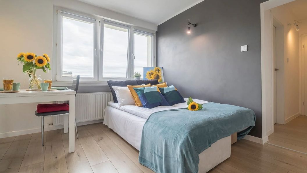 W apartamencie znajduje się przestrony salon z aneksem kuchennym, sypialnia dla dwojga, kameralna sypialnia oraz łazienka. W salonie znajduje się rozkładana kanapa dla dwóch osób, komoda oraz płaski TV. Między salonem, a aneksem jest część jadalniana- rozkładany stół i wygodne krzesła. Aneks kuchenny został wyposażony w niezbędne przybory kuchenne i sprzęty: lodówkę, zmywarkę, czajnik elektryczny, kuchenkę gazową oraz piekarnik. Do dyspozycji gości pozostaje również zestaw do parzenia kawy i herbaty. Jasna, przestronna sypialnia została wyposażona w duże łoże małżeńskie oraz szafę z lustrami. W drugiej sypialni znajduje się sofa przeznaczona dla jednej osoby oraz biurko z wygodnym krzesłem do pracy. Łazienka w jasnych barwach została wyposażona w narożny prysznic. Do dyspozycji gości zapewniamy czyste ręczniki, suszarkę do włosów oraz zestaw kosmetyków.