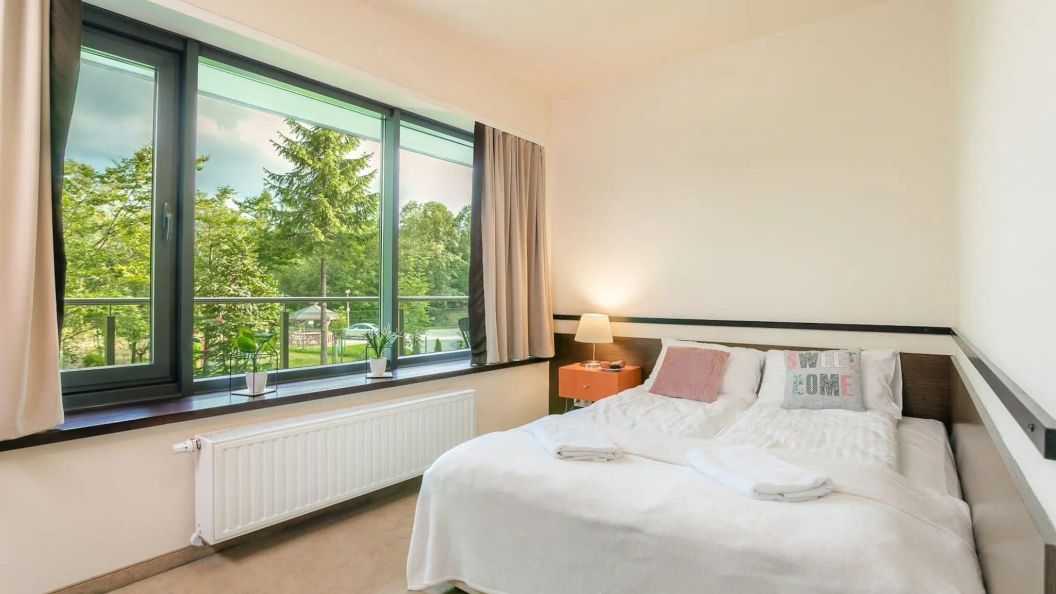 Oferta obejmuje apartament o powierzchni 40 m², przeznaczony dla maksymalnie 4 osób. Składa się on z salonu połączonego z aneksem kuchennym, oddzielnej sypialni oraz łazienki. W sypialni znajduje się podwójne łóżko, natomiast w części dziennej przygotowano rozkładaną, 2-osobową sofę. Do apartamentu przynależy prywatny balkon, z którego roztacza się widok na otaczającą zieleń.