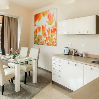 W apartamencie znajduje się w pełni wyposażony aneks kuchenny. Do dyspozycji gości jest płyta indukcyjna, lodówka z zamrażarką, czajnik elektryczny oraz komplet naczyń i przyborów kuchennych.