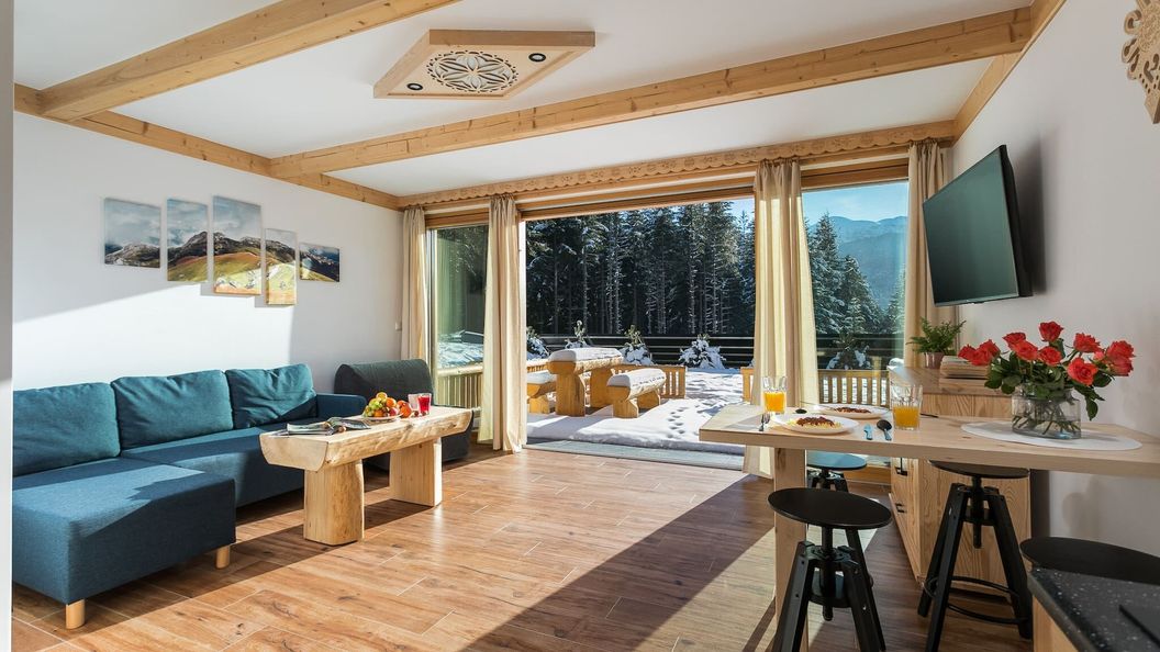 Apartament podzielony jest na strefę dzienną z aneksem kuchennym, prywatną sypialnię, łazienkę oraz taras wyposażony w meble tarasowe. W części dziennej znajduje się sofa, która po rozłożeniu stanowić będzie miejsce do spania dla dwóch osób. Oprócz tego jest tam również fotel. Z nich można podziwiać widok dzięki panoramicznym oknom, a także wyjść przez nie na przestronny taras lub spędzić czas oglądając TV. Obok znajduje się aneks kuchenny wyposażony we wszystkie najważniejsze przybory i sprzęty np. zmywarkę, lodówkę, płytę kuchenną oraz czajnik. W tej części znajduje się także stół jadalniany, przy którym komfortowo można zjeść posiłek w cztery osoby. Prywatna sypialnia zawiera w sobie podwójne łóżko i będzie stanowić świetne miejsce, by odpocząć po dniu pełnym wrażeń. W łazience oprócz wygodnego prysznica do dyspozycji jest także suszarka do włosów oraz niezbędne kosmetyki i świeże ręczniki. Taras został wyposażony w meble ogrodowe i rozciąga się z niego piękny widok na góry.
