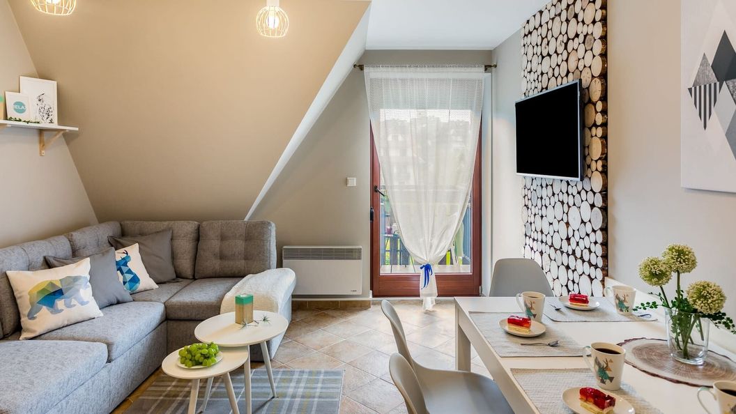 Apartament zlokalizowany jest w malowniczej okolicy Zakopanem, z widokiem na otaczające go góry. Przestronny, przytulny apartament znajduje się w cichej okolicy, na spokojnym osiedlu domów szeregowych, zaledwie 10 minut samochodem od Krupówek - najsłynniejszego deptaka w Polsce, a od dworca PKP/PKS dzieli go tylko 13 minut. Najbliższy przystanek autobusowy oddalony jest zaledwie o 3 minutowy spacer, czyli tyle samo, co sklep spożywczy. Pyszny obiad zjeść możecie w pobliskiej restauracji, do której dojdziecie w 5 minut pieszo.